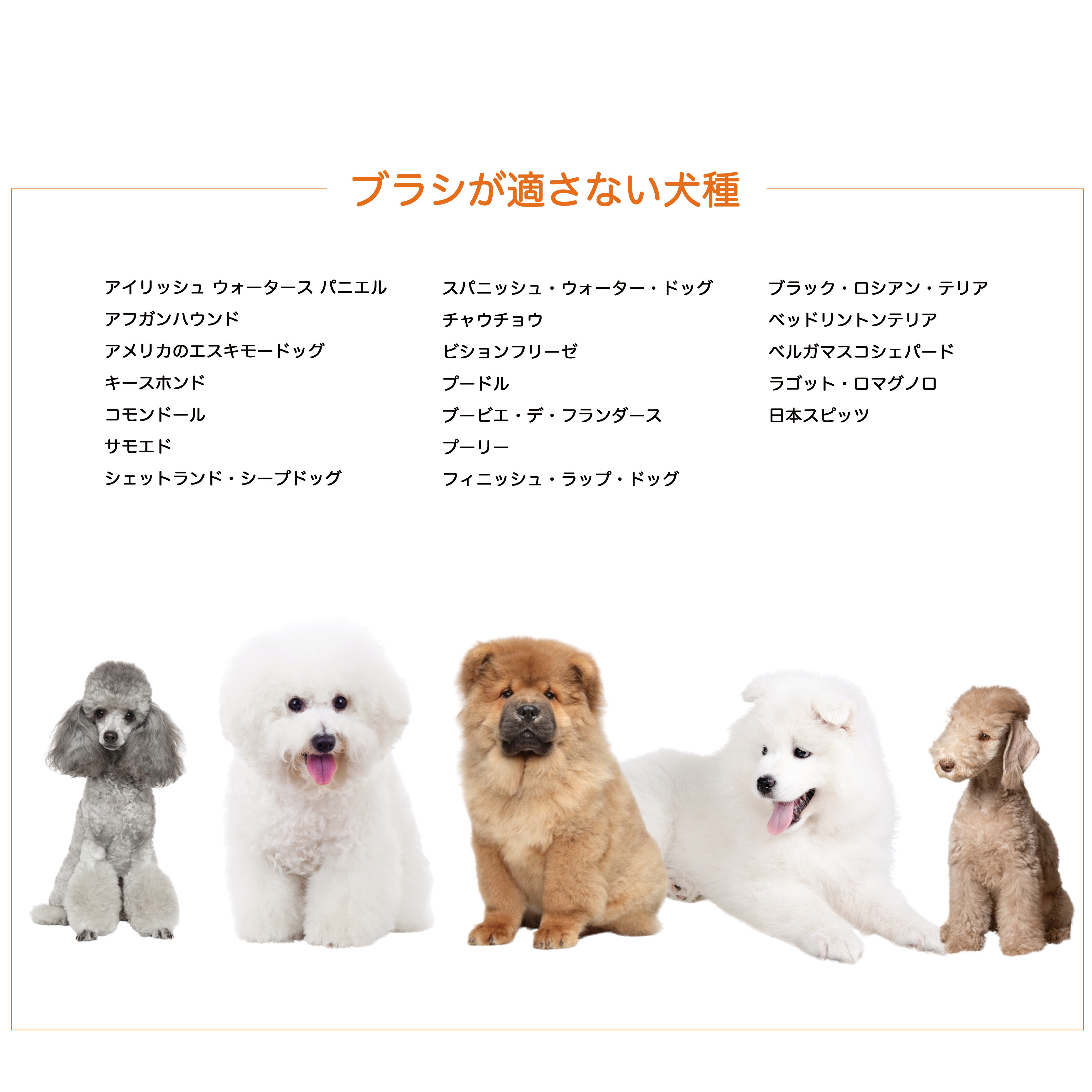 毛並みと同じ方向にブラッシングし頭からしっぽに向かって進めていきます。敏感な部位や特に子犬には配慮してご使用下さい。